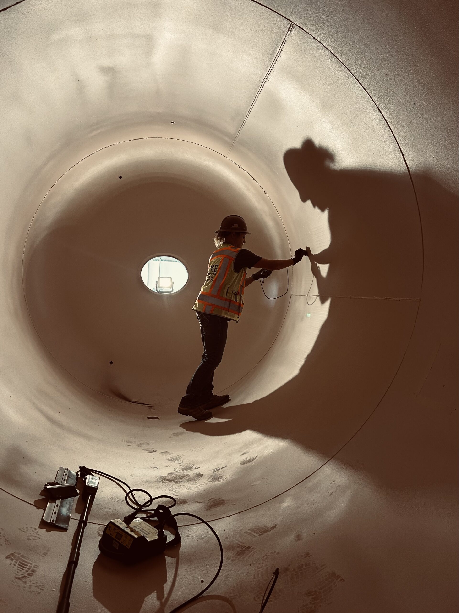 Here’s a behind-the-scenes look at holiday testing, a crucial quality control step in coating inspections. The technician in this photo is inside a metal surge tank at the Orr Ditch BPS/Hydroelectric project. She is using a holiday detector to check for pinholes, cracks, or defects in the coating. Even the tiniest flaw can lead to corrosion over time, so this test ensures the protective layer is solid and continuous. Holiday testing uses high voltage to detect imperfections you can’t see—because when it comes to protection, details matter!