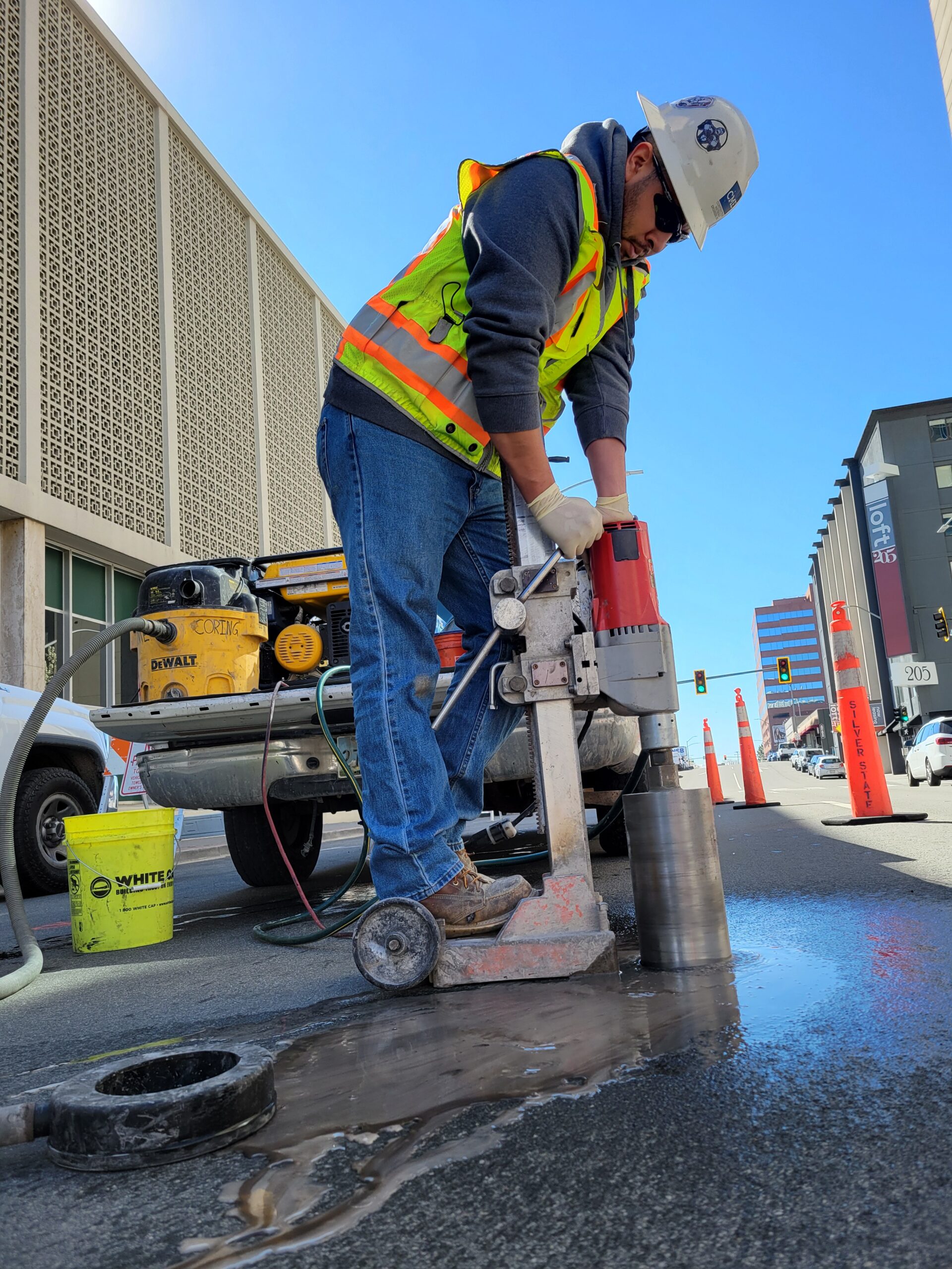 CME doesn’t just core concrete, we core asphalt too! Asphalt coring is when samples are extracted from an asphalt placement project for laboratory testing. The sample is then taken to the CME laboratory to analyze and ensure it is compliant with project specifications. This photo shows our Field Technician, Alex Paz, in action at the Sierra Street Bridge Geotech Project. Photo Credit: Allison Collett, CME Geologist
